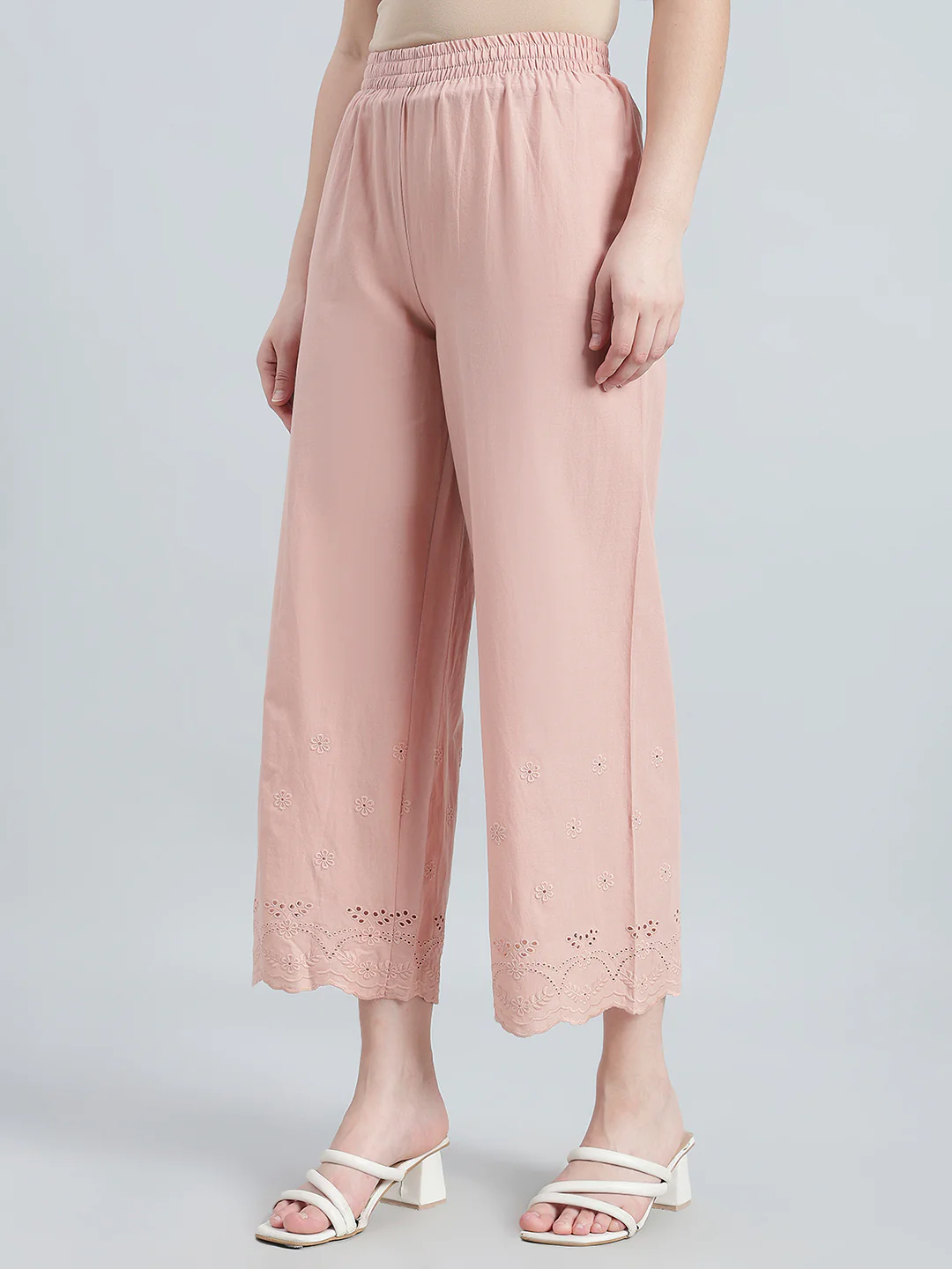 Crafted from breathable cotton, our Baby Pink Hakoba Wide Pant offers a relaxed fit with a mid-rise waist featuring adjustable inner drawstrings and ankle-length cut. Detailed with Floral embroidery at the hem and a side pocket, it blends everyday comfort with effortless ethnic elegance.
