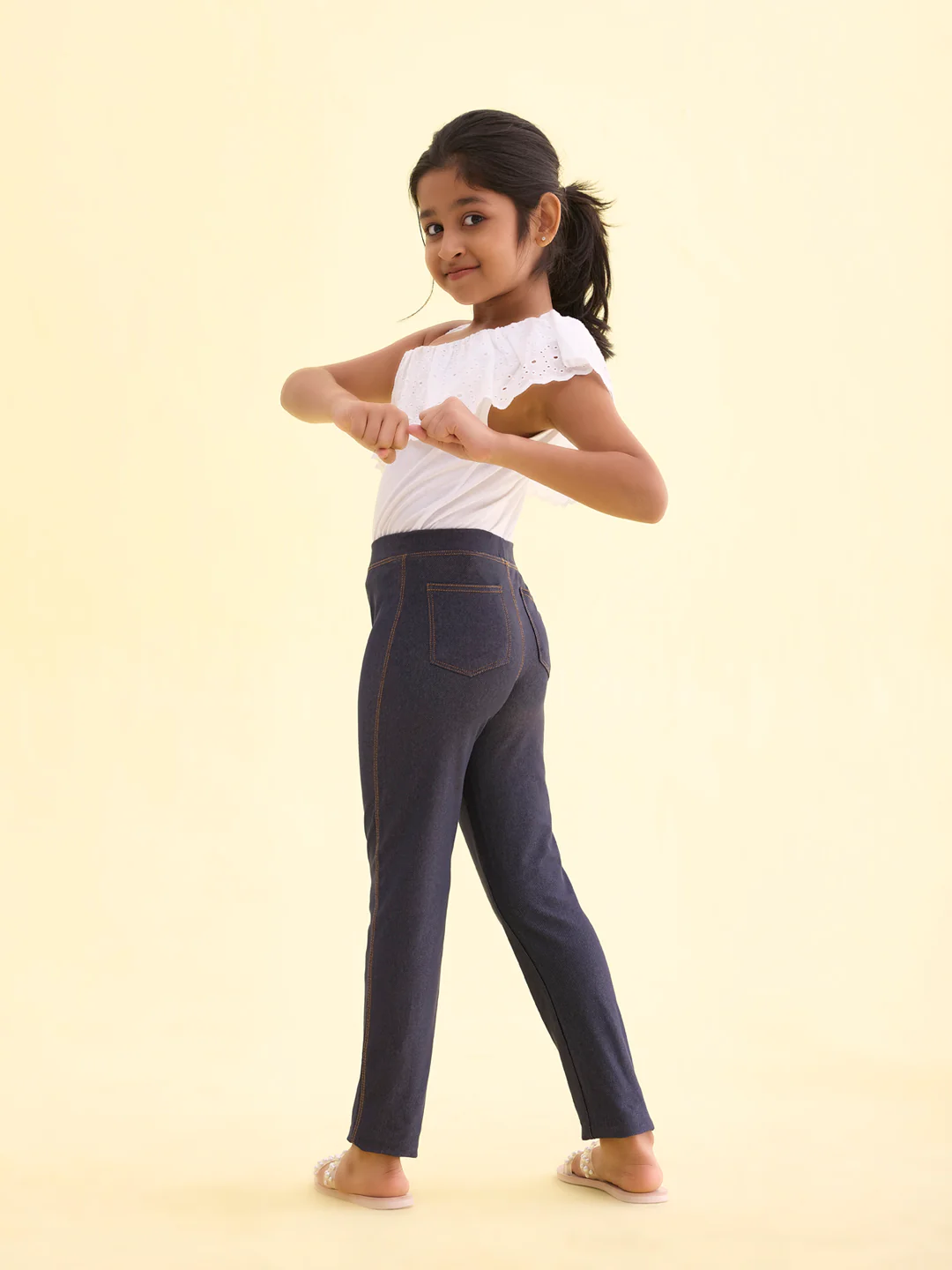 Up your fashion game effortlessly with the Solid Blue Slip On Knit Jeggings. Made from Cotton, Polyester & Spandex, this pair of slip on jeggings have a elasticised waistband, patch pockets at the back & a slim fit.