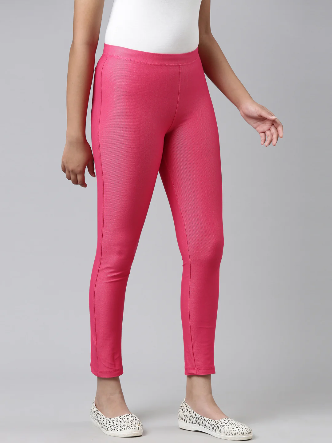 Up your fashion game effortlessly with the Solid Young Fuchsia Slip On Knit Jeggings. Made from Cotton, Polyester & Spandex, this pair of slip on jeggings have a elasticised waistband, patch pockets at the back & a slim fit.