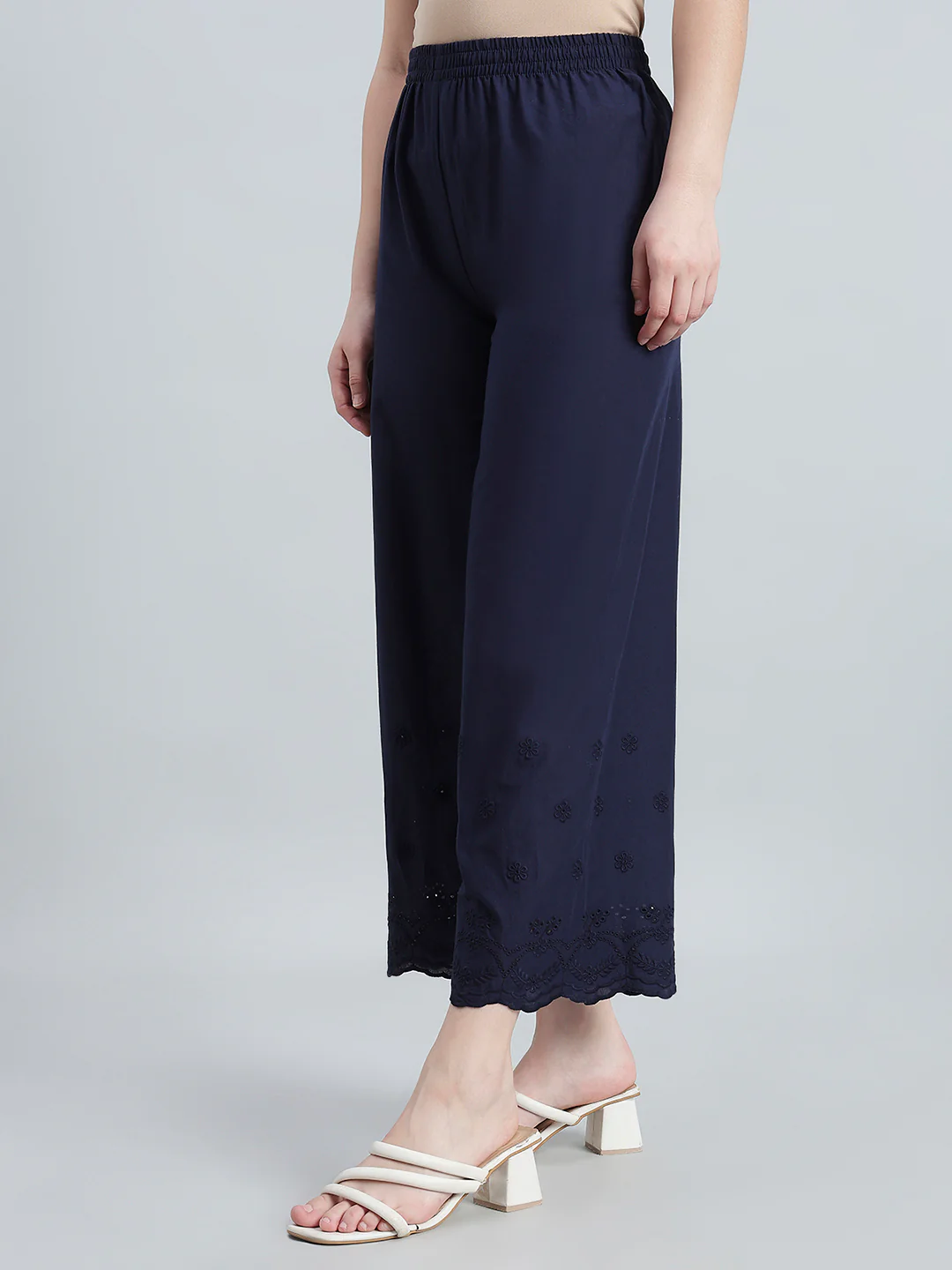 Crafted from breathable cotton, our Navy Hakoba Wide Pant offers a relaxed fit with a mid-rise waist featuring adjustable inner drawstrings and ankle-length cut. Detailed with Floral embroidery at the hem and a side pocket, it blends everyday comfort with effortless ethnic elegance.
