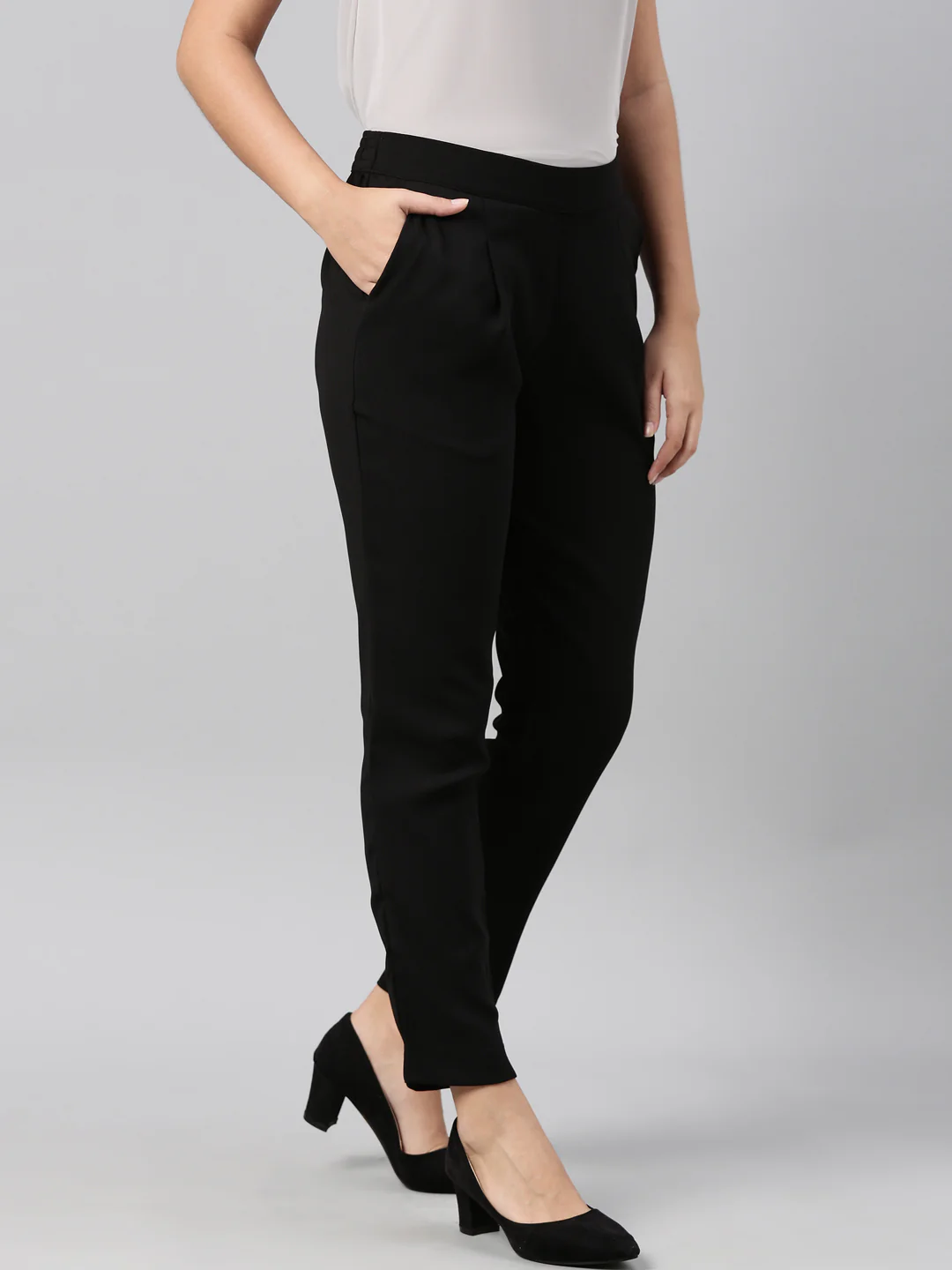 Go from ethnic to Formal look in a jiffy with the Solid Black Formal Trouser. Made from Polyester & Spandex it has a elasticised waistband, a slant pocket.