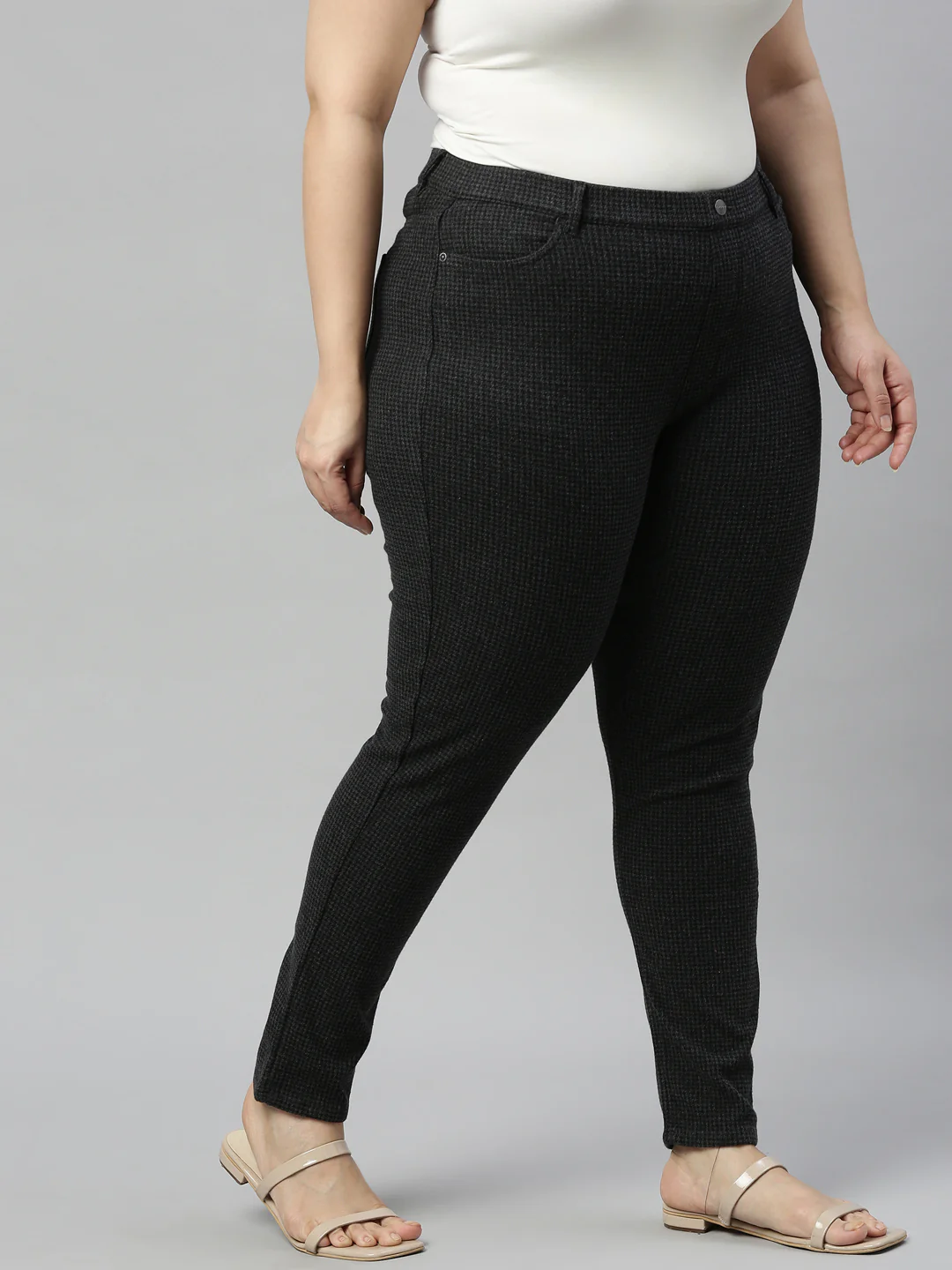 Elevate you style quotient while staying comfortable with the Black Printed Chequered Jeggings. Made from cotton, polyester & Elastane, this super stretch pair jeggings have a button up & zip fly closures, front slant pockets, back patch pockets & is of ankle length.