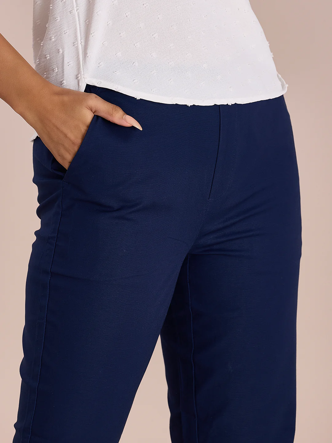 Go from casual to formal look in a jiffy with the Solid Navy Chinos Trousers. Made from Cotton & Spandex, it has a elasticised waistband and slant pockets.