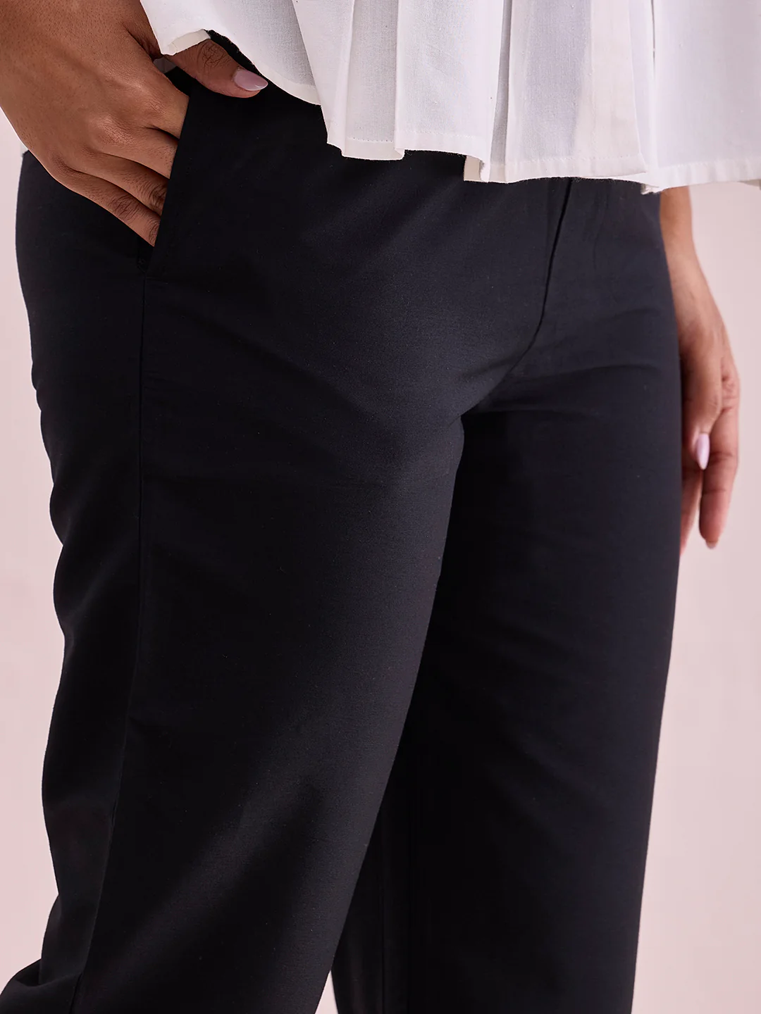 Elevate your ethnic wear with our Solid Black Cropped Metallic Pants. Tailored from modal and polyester, they feature an elasticized waistband, mid-rise waist, relaxed fit, and two pockets for style and comfort