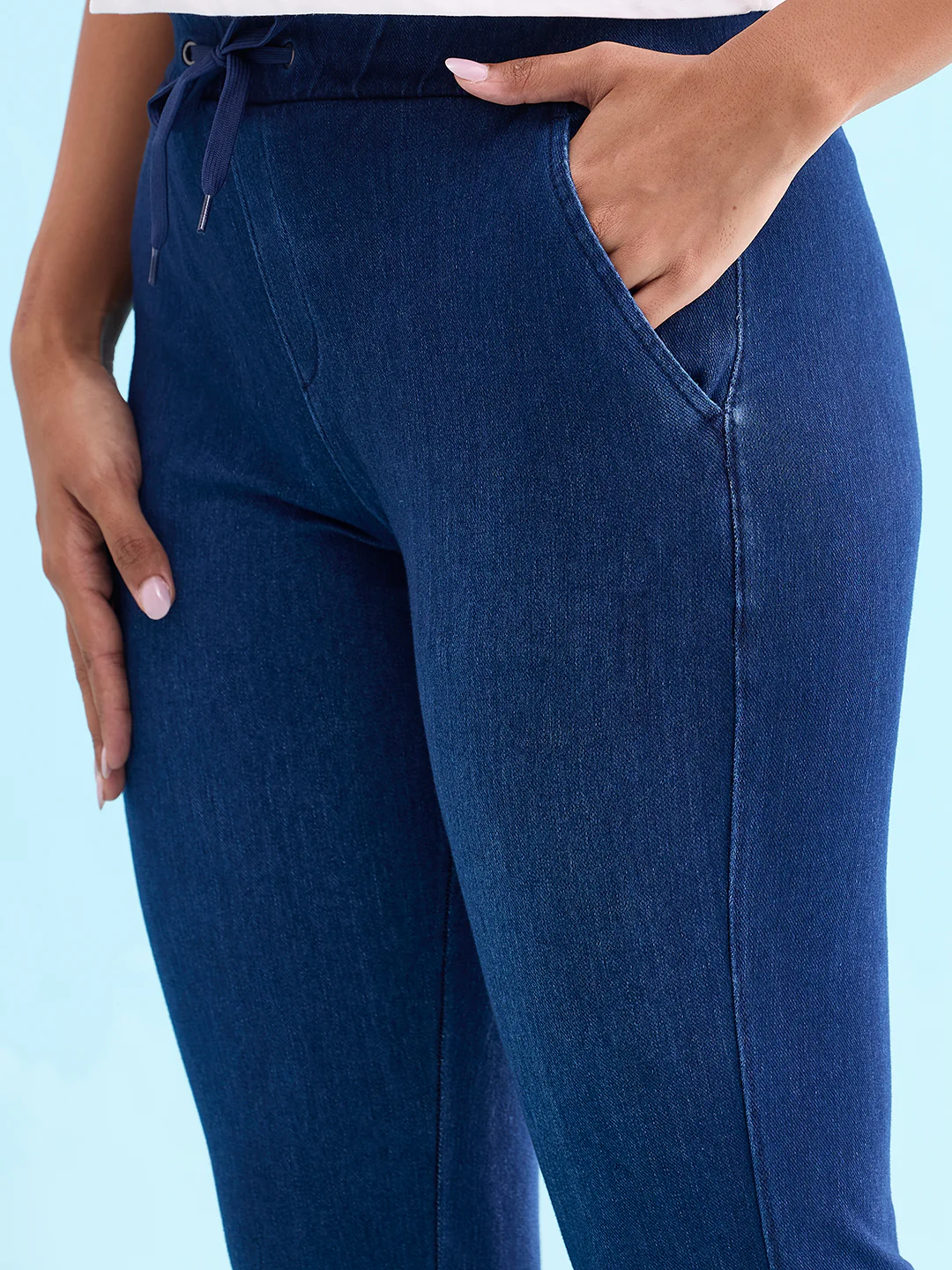 Be comfy while running errands or just chilling with friends in the Solid Blue Denim Denim Joggers. Made from cotton, polyester & elastane, it has a elasticised waistband with drawstring closure, slant pockets & a cuffed hem. It has a relaxed fit.