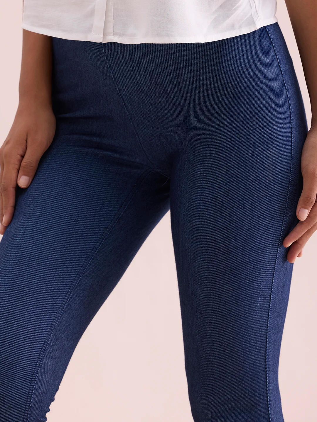Be it a kurti or a tee, the Solid Blue Denim Denim Leggings are your go to bottomwear. Made from knit cotton, polyester & elastane, it has elasticised waistband & a slim fit.