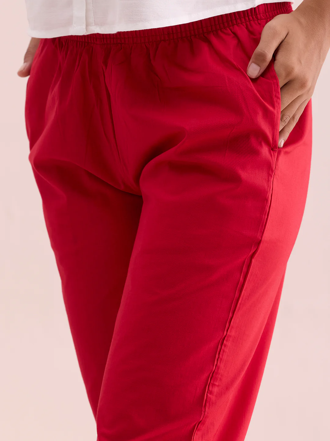 Go from casual to street smark look in a jiffy with the Solid Cherry Cotton Pants. Made from cotton, it has a elasticised waistband with drawstring closure, slant pockets, mid rise & a tapered fit.