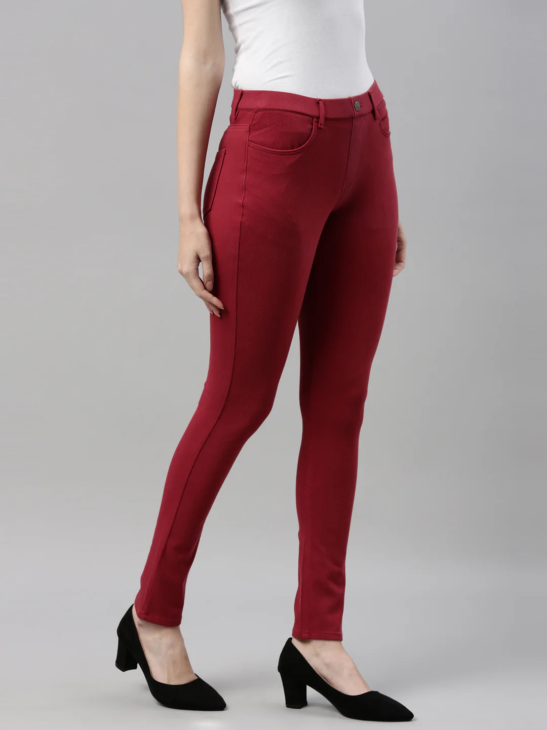 Team up the Solid Cherry Super Stretch Jeggings with a tee or a top for a perfect day or night look. Made from cotton, polyester & elastane, this super stretch pair jeggings have a button up & zip fly closures, front slant pockets, back patch pockets & is of ankle length.