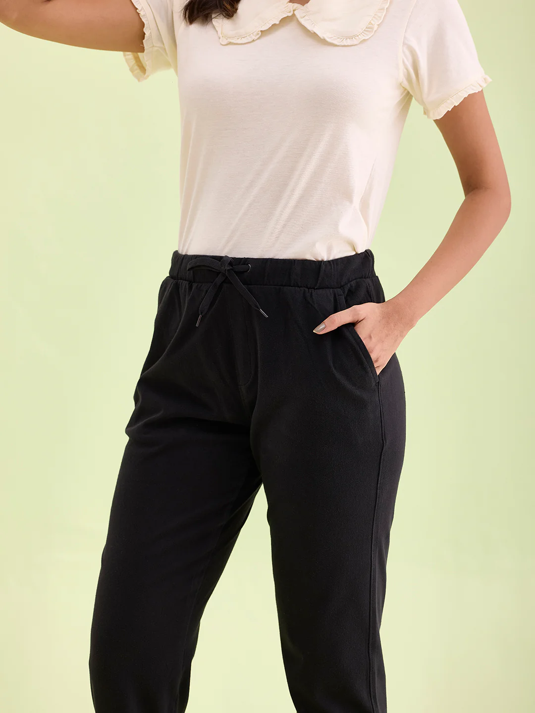 From running errands to casual chilling with friends, Solid Black Joggers are your perfect pair of bottomwear. Made from cotton, polyester & elastane, it has elasticised waistband with drawstring closure, slant
