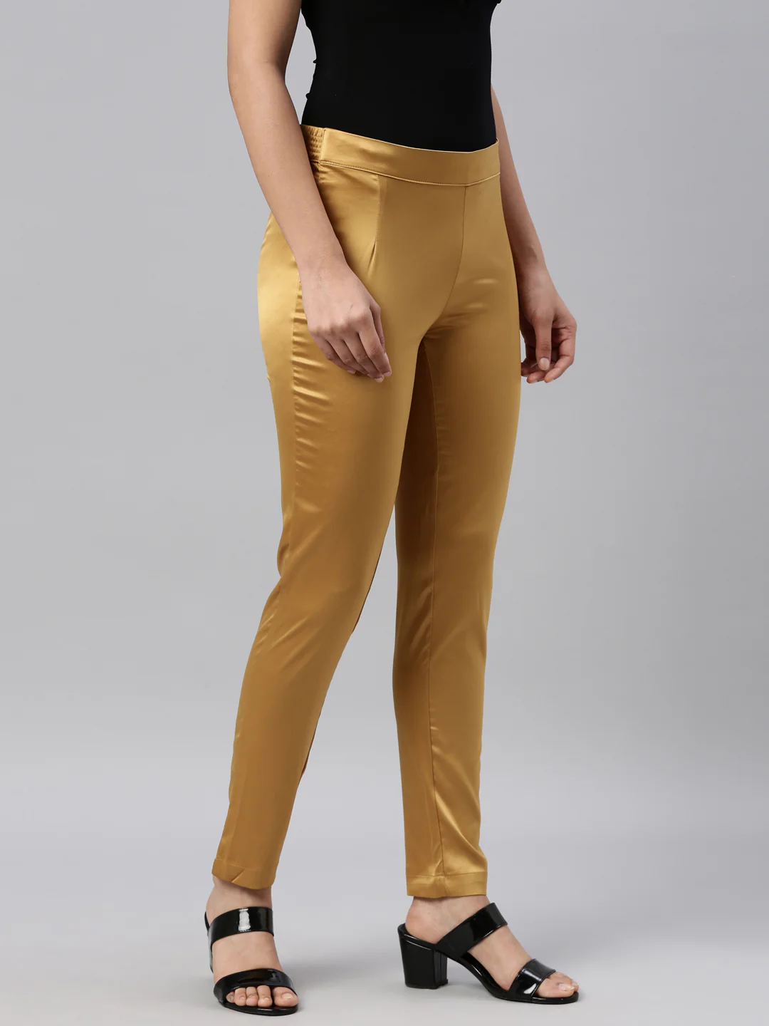 Be it any occasion, the Solid Mustard Shiny Pants can elevate any look of yours. Made polyester & spandex, it has a elasticised waistband with a concealed zipper & slim fit.
