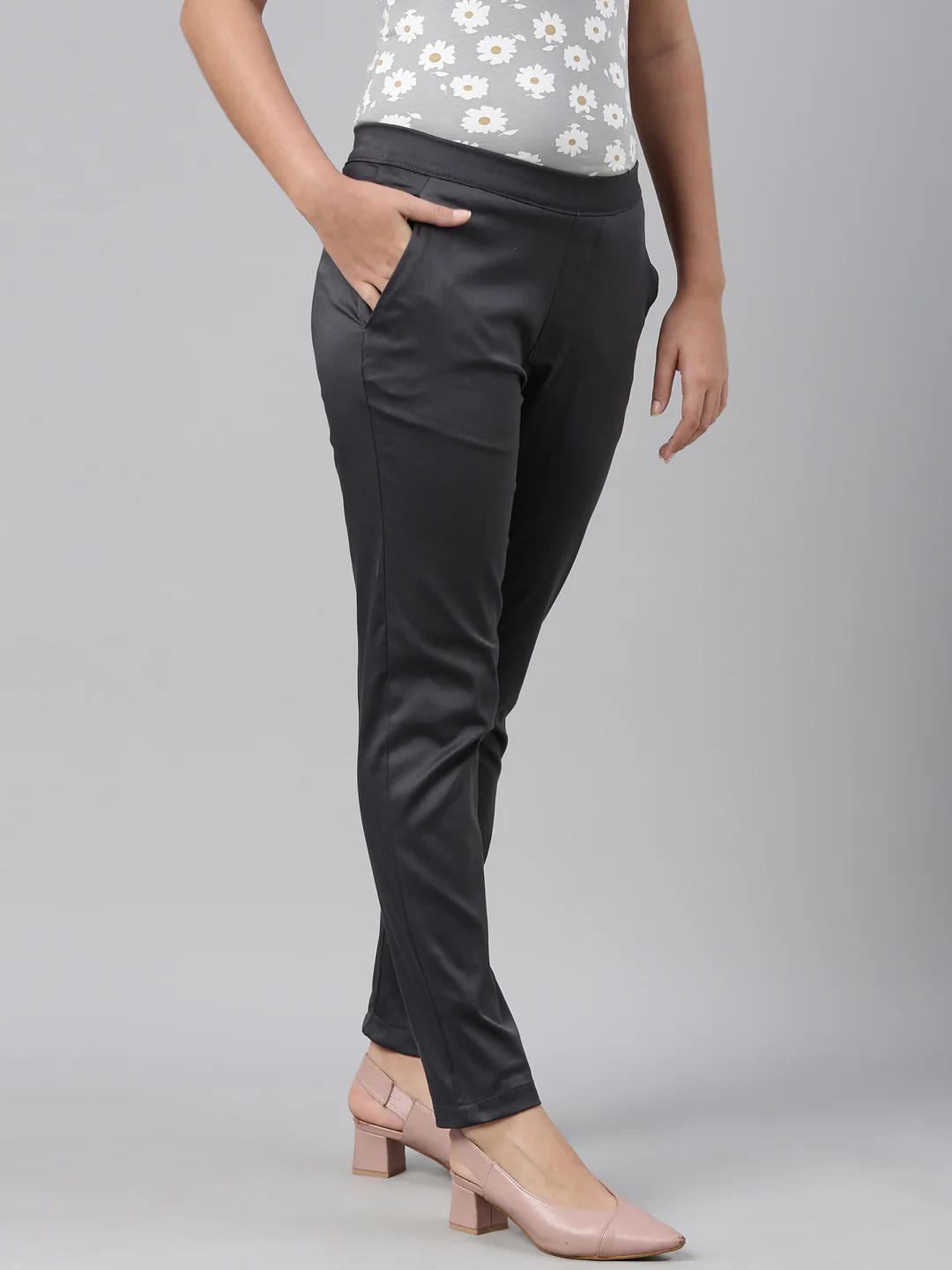 Bring a twist to your everyday work wear with the Solid Silver Grey Mid Rise Treggings. Made from cotton, it has a elasticised waistband, slant pockets & is of a slim fit.